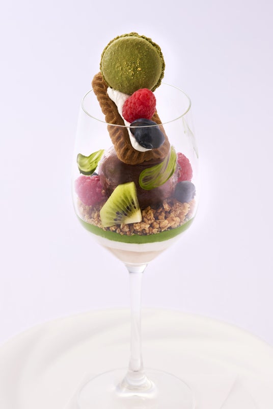 展覧会のイメージカラーであるグリーンを、抹茶マカロン・ピスタチオソースで表現し、濃厚なチョコレートアイスクリームとフルーツを合わせました。