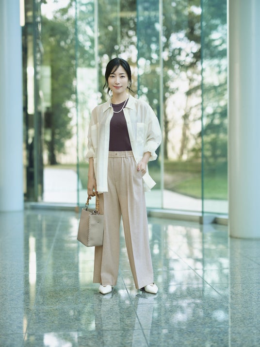 トップスの色はシーンごとに変化します。豊富なカラーバリエーションに加え、光や風をまとうように洋服の印象が移ろう演出で、リネンならではの軽やかな素材感と、スタイリングが崩れにくいハリ感を表現しました。