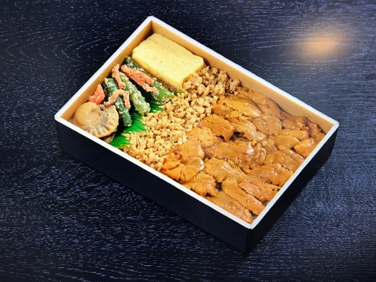 うにそぼろとしっとりとした生うにをのせた、うに好きにはたまらない贅沢なお弁当。