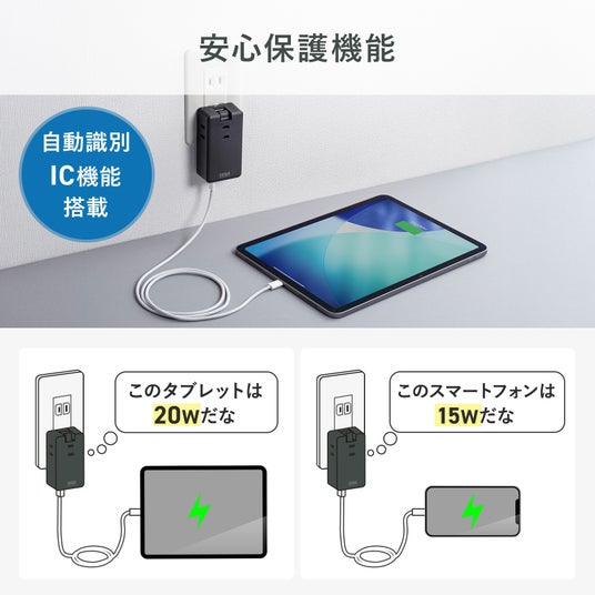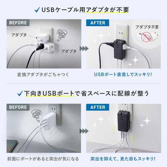 デバイスごとのACアダプタが不要で、コンセント周りの混雑を解消。さらに下向きに配置されたUSBポートが、前面への出っ張りを最小限に抑え、見た目も綺麗に配線ができます。
