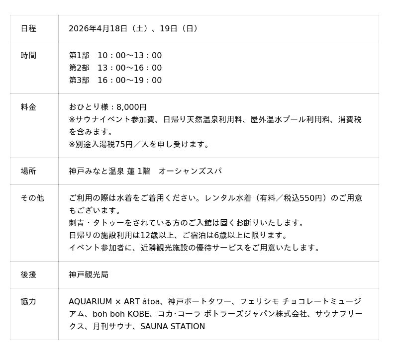 神戸みなと温泉 蓮(総支配人:横山 秀樹、所在地:神戸市中央区)は、2026年4月18日(土)、19日(日)に、「10周年 感謝温冷!天幕蒸風呂(かんしゃおんれい!テントサウナ)」を開催いたします。同イベントは1月に天候不良により中止となりましたが、開催を望むお声をいただき、このたび復活開催が決定いたしました。