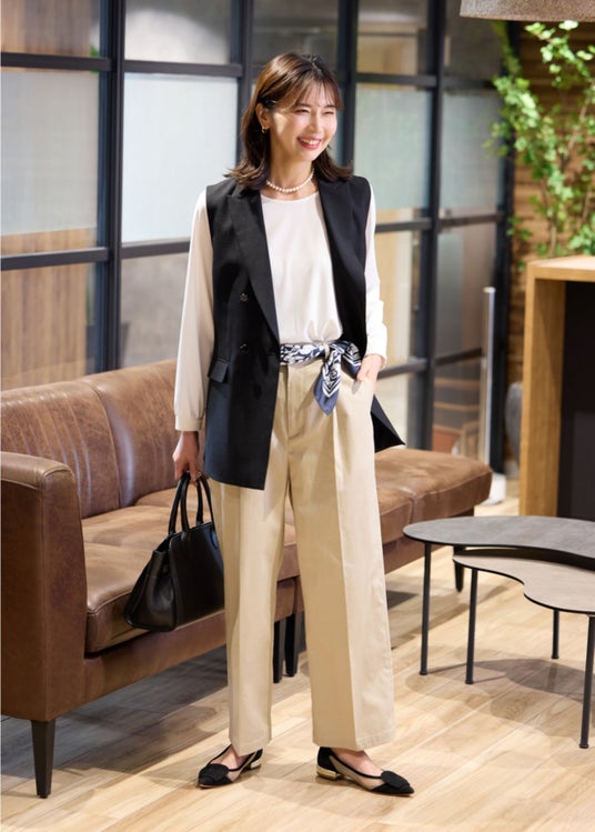 軽やかに羽織るだけで装いが引き締まり、通勤や会議などきちんと感が求められるシーンにも活躍。シームレスに着回せるジレは、日常の装いを格上げしてくれる頼れる一着です。