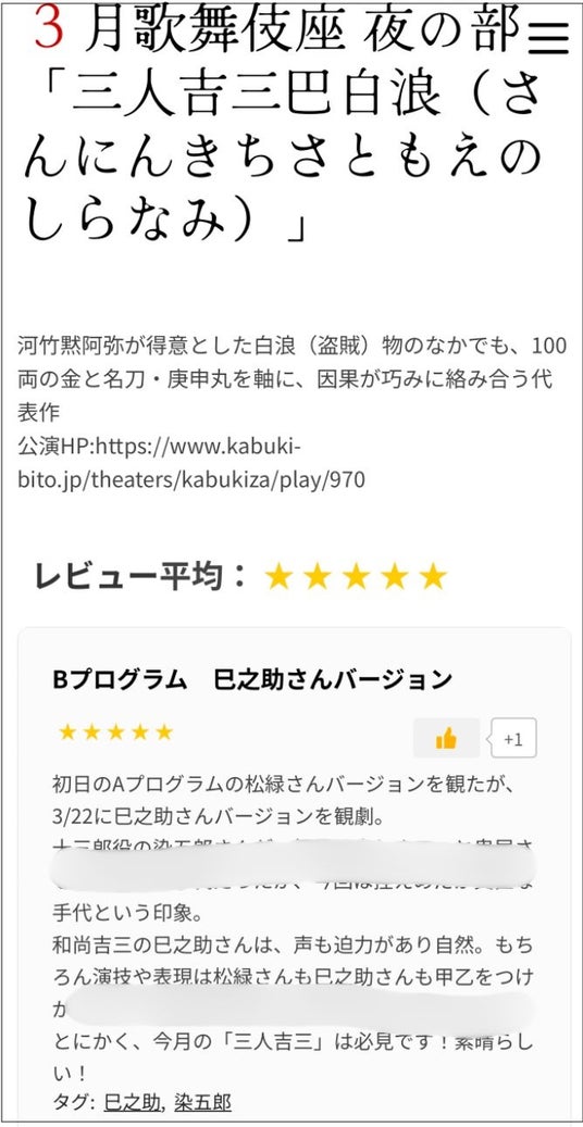他の人の感想をきっかけに、新しい演目や役者の発見をマッチング