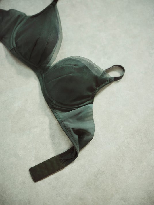 カップ部分のチュールが重なり合うことで生まれる陰影が、シンプルでありながらセンシュアルな表情を演出します。