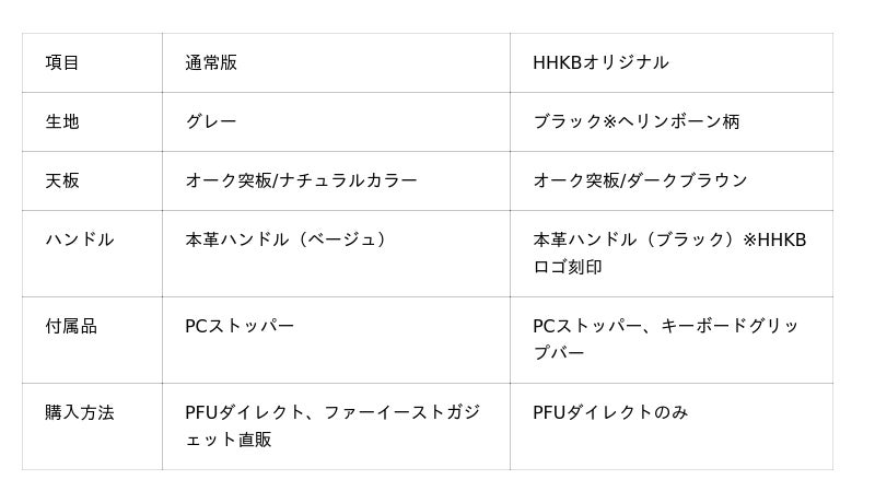 今回の連携により、ナチュラルカラーの通常モデルに加え、HHKBとそのユーザーの皆様への最適化を意図した「デスクエニウェア2(HHKBオリジナル)」をPFUダイレクト限定で発売します。ダークトーンのカラーリングとHHKBロゴ入りの本革ハンドルを採用しており、落ち着いた色合いがガジェットの佇まいをより引き立てます。