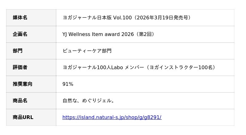 北海道の自然の恵みを活かしたスキンケアを製造・販売する株式会社ナチュラルアイランド(北海道札幌市、代表取締役社長:小松 正和)が展開する「自然な、めぐりジェル。」が、2026年3月19日(木)発売のヨガジャーナル日本版 Vol.100に掲載された「YJ Wellness Item award 2026(第2回)」において、ビューティーケア部門にノミネートされました。