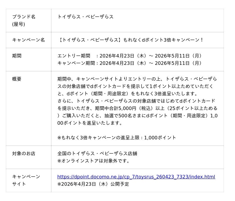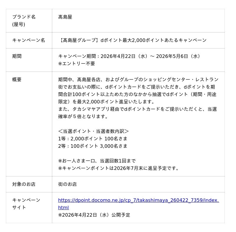 株式会社NTTドコモ(以下、ドコモ)は、「dポイント」においておトクなキャンペーンを開催いたします。詳細は、下表のとおりです。