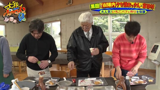 摘んだいちごを使った「いちごパフェづくり」も体験。「もう食べられへん……」と弱気になりながらも、いざ作り始めると大はしゃぎ。ソフトクリームを上手に巻けない孝則&智則に、黒田は「陣内という名は手先不器用なんちゃうか」とからかう。