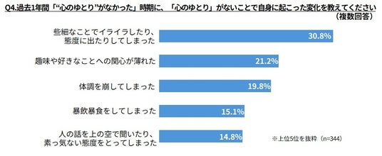 Q1で「“心のゆとり”がなかった」と答えた方に、「心のゆとり」がないことで生じるネガティブな変化を聞いてみました。「些細なことでイライラしたり、態度に出たりしてしまった」(30.8%)が最も高く、「趣味や好きなことへの関心が薄れた」(21.2%)、「体調を崩してしまった」(19.8%)など、「心のゆとり」の有無が心身に影響を及ぼしていることが明らかになりました。