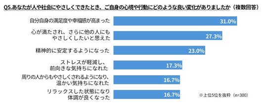 Q2で過去1年間を振り返り人や社会に「やさしくできた」と回答した方に、そのときの自身の心境について聞きました。「自分自身の満足度や幸福感が高まった」(31.0%)「心が満たされ、さらに他の人にもやさしくしたいと思えた」(27.3%)といった変化を感じていることが分かりました。 「やさしさ」と「心のゆとり」は互いに影響し合い、さらに次の「やさしさ」を生む可能性があることが示唆されます。