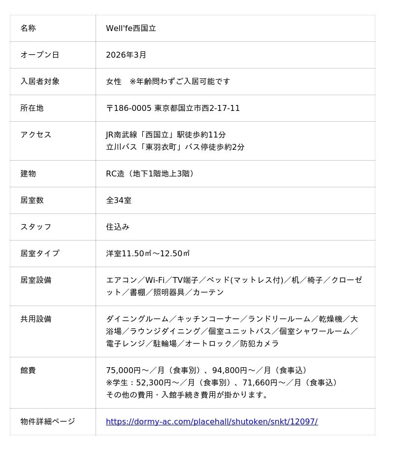 「ドーミー」の名称で全国約500棟以上の学生寮・社員寮を展開する株式会社共立メンテナンス(以下、共立メンテナンス/代表取締役社長:中村 幸治/本社:東京都千代田区)は、東京都国立市に、食事付きサービスレジデンス『Well’fe西国立(うぇるふにしくにたち)』を2026年3月にオープンいたしました。