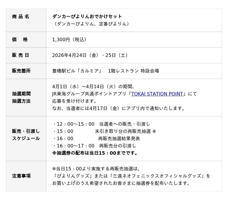 ジェイアール東海フードサービス株式会社(本社:愛知県名古屋市、代表取締役社長:岩下賢一)は、豊橋駅ビル「カルミア」にて、豊橋市をホームタウンとするプロバスケットボールクラブ「三遠ネオフェニックス」の人気マスコット『ダンカー』とコラボレーションした「ダンカーぴよりん」を期間限定で販売いたします。「ぴよりん」が、三遠ネオフェニックスのマスコット『ダンカー』をモチーフにした特別仕様で登場。豊橋でしか出会えない限定ぴよりんとして、地域の魅力とともにお楽しみいただける一品です。