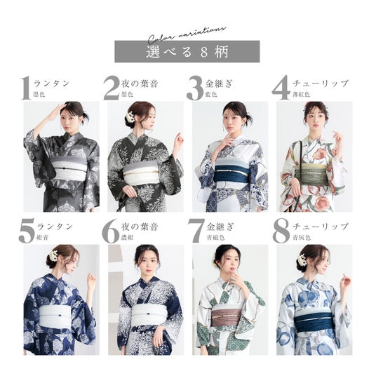 選べる全8柄&トレンドの「しわ兵児帯」セット展開大人向けの落ち着いた古典柄から、華やかなモダン柄まで、KIMONOMACHIデザイン担当スタッフが手掛けたオリジナルデザイン全8柄(4柄2配色)をラインナップ。単品販売に加え、ふんわりとしたボリューム感で気になるお腹・お尻周りを可愛くカバーできる、トレンドの「しわ兵児帯」とのコーディネートセットもご用意しています