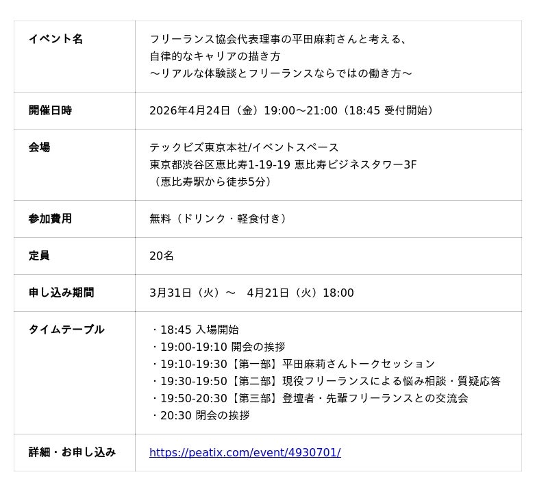 国内最大級のITフリーランス向けエージェント「TECHBIZ」をはじめとした、フリーランスと企業のマッチングサービスを運営する株式会社テックビズ(本社:東京都渋谷区、代表取締役:中島一樹、以下「テックビズ」)は、「フリーランスのリアルな体験談や働き方」をテーマにしたトークイベント・交流会を4月24日(金)19時より、テックビズ恵比寿本社・イベントスペースにて開催いたします。登壇者には、一般社団法人フリーランス協会代表理事としてフリーランスの社会的立場向上に長年取り組んできた平田麻莉さんをお招きします。フリーランスという働き方のリアルを軸に、その魅力やご自身の体験談についてお話しいただきます。また、平田さんに女性フリーランスからの質問に答えていただく公開悩み相談の時間や、参加者同士が横のつながりを築ける交流の場も設けます。