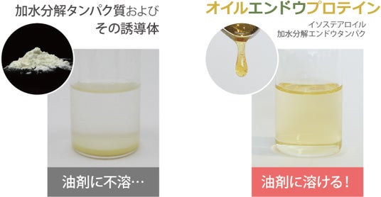 近年、ヘアケア市場において、ヘアカラーやパーマ、紫外線などによる毛髪ダメージへの関心が高まっています。これに伴い、毛髪の主成分であるタンパク質に着目したアプローチがヘアケア処方において広く採用されています。しかしながら、従来このコンセプトは主に水溶性タンパク質によって実現されており、ヘアオイルなどの油性処方への応用は技術的に困難とされてきました。こうした背景のもと、当社はこれまでに培ってきた油溶性PPT(加水分解タンパク質)誘導体(ケラチン、コラーゲン、シルク等)の開発技術を応用し、エンドウ豆由来の油溶性PPT誘導体「Promois EJ-118(CT)」の開発に成功しました。
