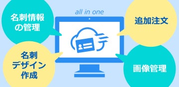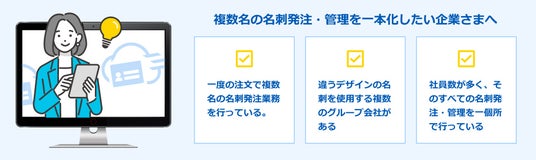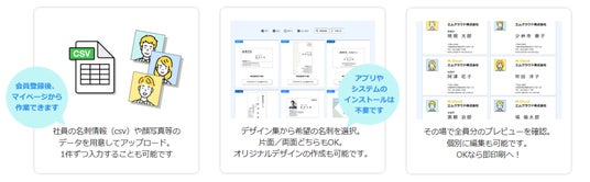 複数の社員の名刺情報をCSVで一括登録し、ご希望のデザインを選ぶだけで簡単に全員分の名刺を作成できる同サービス。名刺の作成・管理・印刷発注・追加注文をすべてWebで完結できるので、わずらわしかった名刺発注・管理業務が飛躍的に向上します。