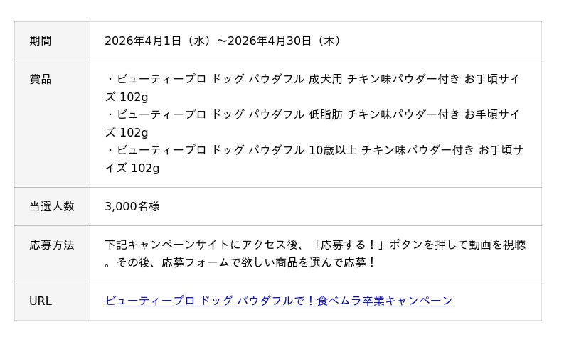 2026年4月1日~4月30日、日本ペットフード株式会社(本社:東京都品川区、代表:代表取締役社長執行役員 片山 俊次)は、「ビューティープロ ドッグ パウダフルで!食べムラ卒業キャンペーン」を実施いたします。