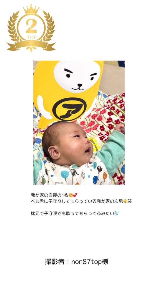 眠るお子様の傍らで「べあ君」が優しく見守る姿は、まさに本コンテストを象徴する「自慢の一枚」です。キャラクターに新しい役割(子守唄を歌うシッター)を見出した独創性と、深い癒やしを与える写真の力が、多くの審査員の感動を呼びました。
