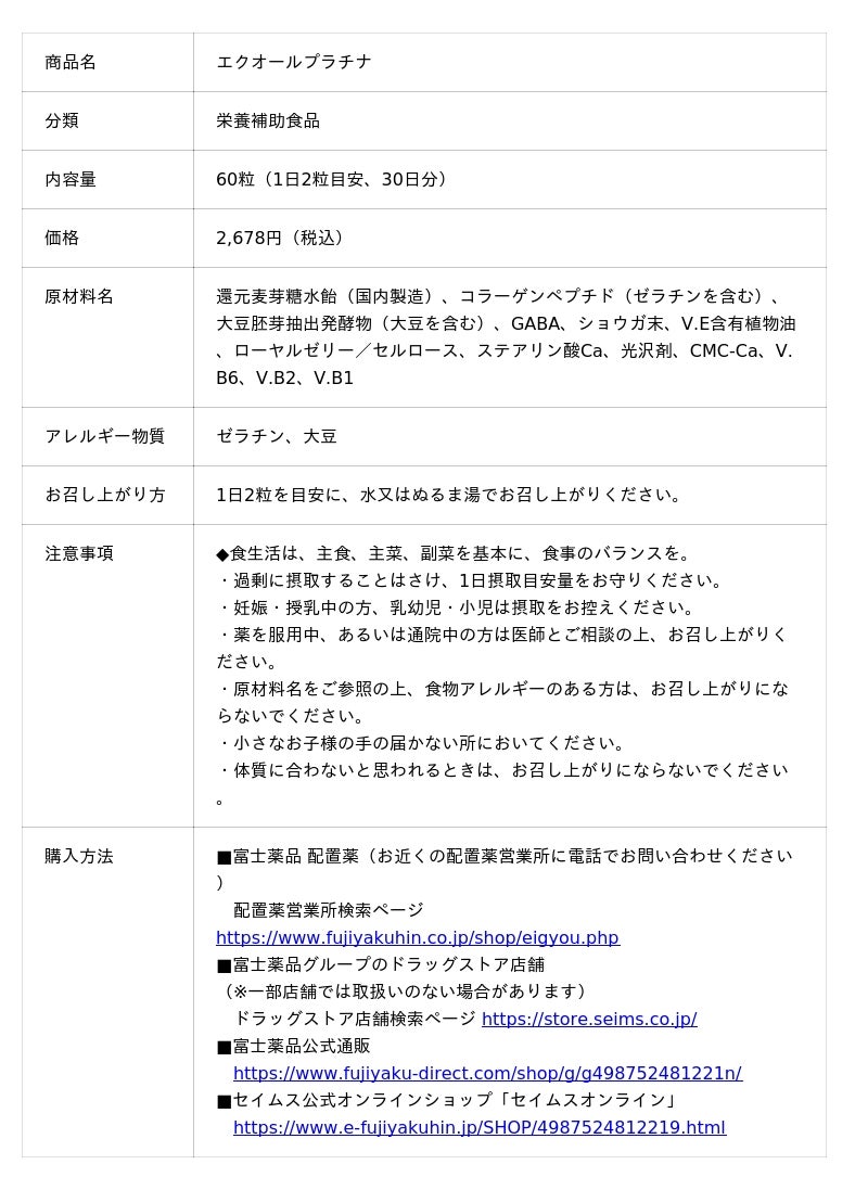 医薬品の開発から製造・販売までを行う複合型医薬品企業の株式会社富士薬品(本社:埼玉県さいたま市 代表取締役社長:高柳 昌幸、以下「富士薬品」)は、働き盛りの女性に寄り添うサプリメント「エクオールプラチナ」(栄養補助食品)が、「anan」(2026年4月1日発売号)の『ananカラダにいいもの大賞2026・春』を受賞しましたので、お知らせします。