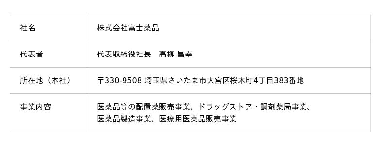 富士薬品は、1930年富山県富山市における配置薬販売業の創業からスタートし、現在では配置薬販売事業に加えて、ドラッグストア・調剤薬局事業、医薬品製造事業、医療用医薬品販売事業を展開する複合型医薬品企業です。スローガン「とどけ、元気。つづけ、元気。」のもと、富士薬品グループ全体で日本全国に1,285店(2026年3月末時点)を展開する「セイムス」ブランドを中心としたドラッグストアと、全国に広がるラストワンマイルを埋める配置薬販売ネットワークを生かし、誰もが豊かな人生を送れる社会の実現に向けて、人々の暮らしのあらゆる場面で寄り添い、元気な生活を支え続けてまいります。