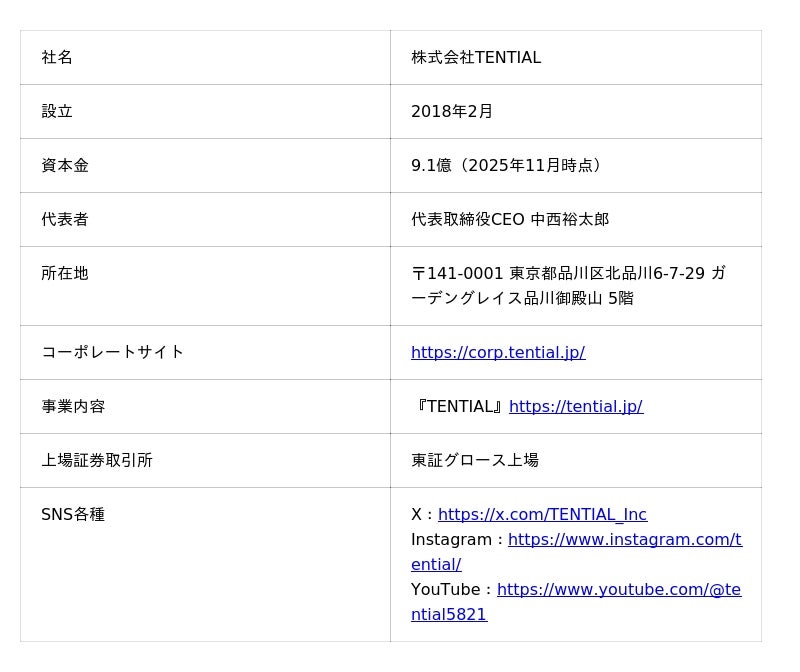 コンディショニングブランド『TENTIAL』は、アスリートの知見と最新技術・研究に基づき、機能性を追求した製品・サービスを提供。24時間365日、日常生活のあらゆるシーンで心身を整え、疲労回復やパフォーマンス向上をサポートするコンディショニング活動を推進しています 。すべては個人のコンディションとポテンシャルを引き出すという信念のもと、株式会社TENTIALは、健康に前向きな社会の実現のため、コンディショニングの社会実装に取り組んでまいります。