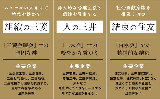 なぜ三菱は「組織」を重要視するのか、なぜ三井に「自由な雰囲気」があるのか、なぜ住友に「絆の強さ」を感じるのか……各グループの歴史がわかれば、そのキャラクターにも深い理解を示すことができます。
