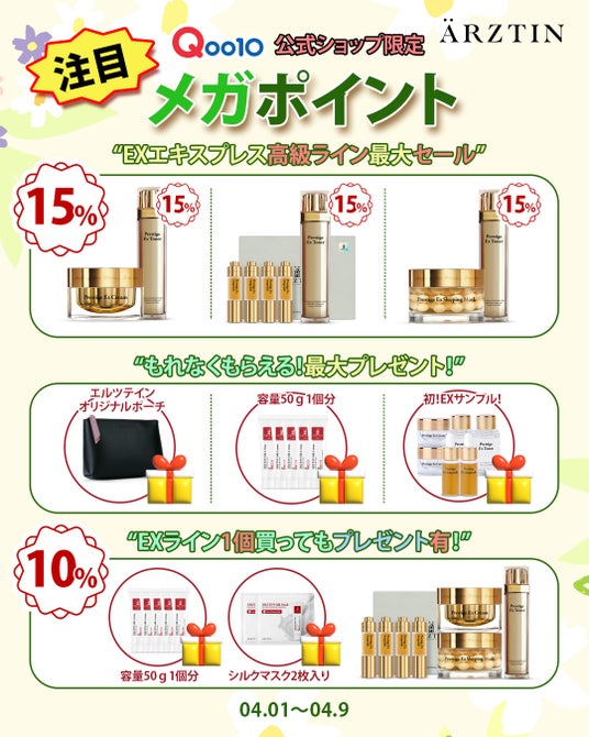 今回エルツティンQoo10メガポイントで最大70%セール+メガポを行う。注目は様々なセット構成が有り、史上最大プレゼントをもらえる!チャンス!全員プレゼントでS2NDニュープラネットティント1個(色ランダム)とエルツテイン人気商品サンプルセットや5,000円以上ご購入の方はS2NDカラーライズスターリーアイズ1個(色ランダム)でさらに10,000円以上にはエルツテインシルククレンジングフォーム(150ML)(定価3,190円税込)をプレゼントもらえるチャンス。そうして、エルツテインの高級ラインプレステージEXラインもメガポイントに初参戦!お得なセットの企画もあり、シルクラインをより安く買える機会もある。特に今回はシルククレンジングフォームとヒアセララインがビックセール中!よりお得なショッピングが可能。エルツティンメガポイントを楽しんで下さい。詳細はイメージを参考してください。