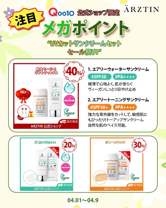 そうして、エルツティンのヴィーガンラインの『エアリーウォーターサンクリーム』20%セール『エアリートーニングサンクリーム』も30%セールでメガポイントに参戦する。2個セット構成は40%セール中でしるくクリーム10g2個付きエルツテインのUVカットはしっとりとしたスキンケアクリームのようなマイルドなつけ心地で優しく使えるUVカットの日やけ止めである。ベビーから大人まで使える優しい日やけ止めで紫外線から肌を守ってマイルドな潤いが肌を保護してくれる。