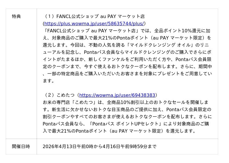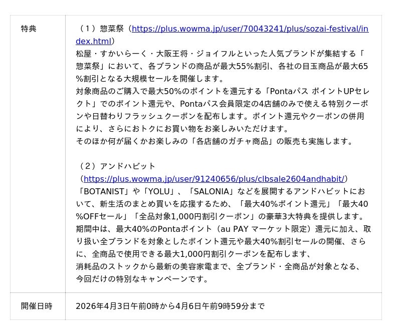 auコマース&ライフは、運営する総合ショッピングサイト「au PAY マーケット」において、4月の三太郎の日・お買い物ラリーで、松屋・すかいらーく・大阪王将・ジョイフルといった人気ブランドが集結する「惣菜祭」の開催や母の日ギフトの「早割」セール、新生活の買い足しに嬉しいお米や美容アイテムのポイントアップなど、春の暮らしを彩る商品をおトクに提供します。