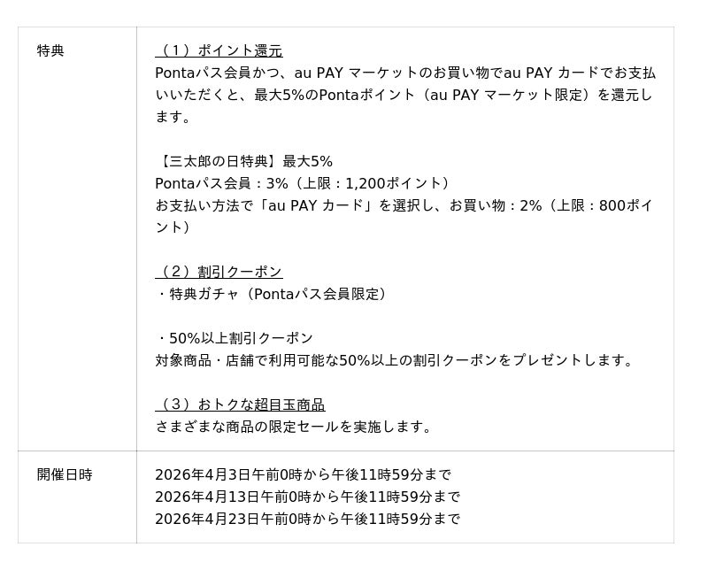さらに、2026年4月13日午前0時から14日の午前9時59分まではポイント超超祭との同時開催により合計で最大46%のポイント還元となり、2026年4月23日は購入店舗数に応じて、還元率がアップする「BIGお買い物ラリー」の開催により、三太郎の日特典とあわせて最大45%のポイント還元となります。