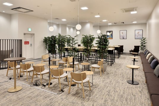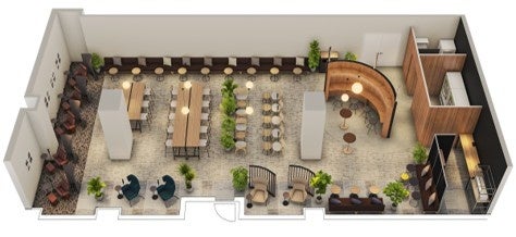 内装イメージ。右上の円形スペースでは不定期にイベントを開催予定。中央はベンチやハイチェア、ソロブースを配した一人用ゾーン。左側にはフットレスト付きリクライニングチェアでパワーナップをサポート。