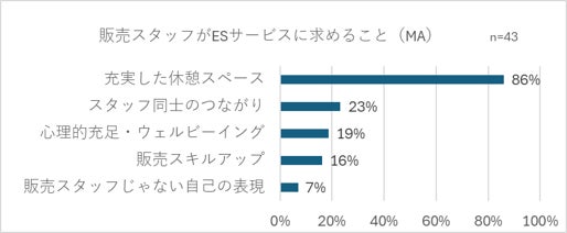 実際に、2026年2月に実施した販売スタッフへのアンケート調査では、施設に求めるESサービスとして最も多かったのは「充実した休憩スペース」、次いで「スタッフ同士のつながり」「心理的充足・ウェルビーイング」「販売スキルアップ」という結果でした。
