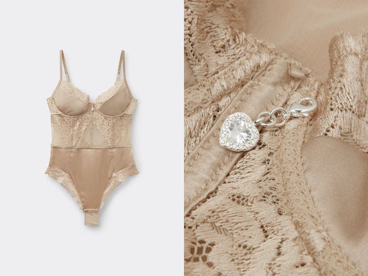 伸縮性のあるシルクサテンに柔らかなチュールを組み合わせたボディスーツ。花の刺繡を施したレースがエレガントでロマンチック。バスト中央には、ラインストーンをあしらったハート型のチャームがきらりと光ります。単品でトップスとしても、ジャケットのインナーとしてもお使いいただけます。