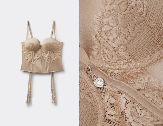 伸縮性のあるシルクサテンを使用した、エレガントで洗練されたゲピエール。花の刺繍を施したレースがロマンチックなムードを演出。バスト中央には、あしらったきらりと光るハート型のラインストーンチャームは、取り外し可能。パイピングとチュールのインサートでビスチェ風に仕上げたこのアイテムは、見せるように着用したり、ジャケットのインナーとして着用したりするのがおすすめです。