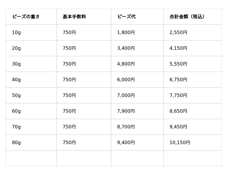 – 10g単位(最大80gまで)で、お好きなビーズをお選びいただけます。