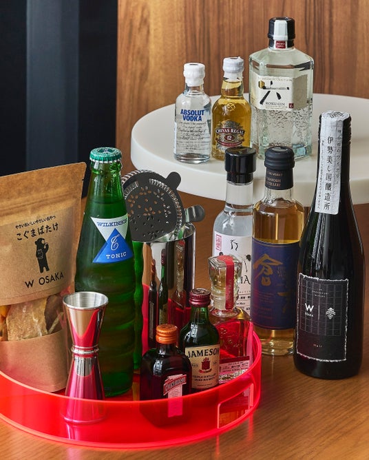 2名様分の朝食に加え、滞在中にはランチまたはアフタヌーンティーをお楽しみいただける特典もご用意。館内のダイニングで過ごすひとときが、滞在をより豊かに彩ります。また、「Supreme Suite」および「Penthouse」にご宿泊のお客様には、客室内『Mix Bar(ミックスバー)』を無料でご利用いただけます。毎日補充される『Mix Bar』には、厳選されたドリンクを取り揃え、気分に合わせて自由にお楽しみいただけます。W大阪のために特別に醸造された、三重県・伊勢志摩に誕生したワイナリー「伊勢美し国醸造所」による赤・白ワインをはじめ、こだわりのセレクションが、スイートでのひとときをより印象的に演出します。