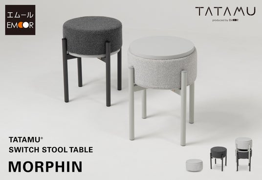 人間工学に基づいた空間有用性と安全な使い心地を両立するトランスフォーム家具ブランドTATAMU(R)を展開する株式会社エムール(東京都立川市:代表取締役 高橋 幸司)は、2026年4月2日より、スタッキングできるスツール&テーブル「MORPHIN(モーフィン)」(以下、モーフィン)の販売を開始しました。