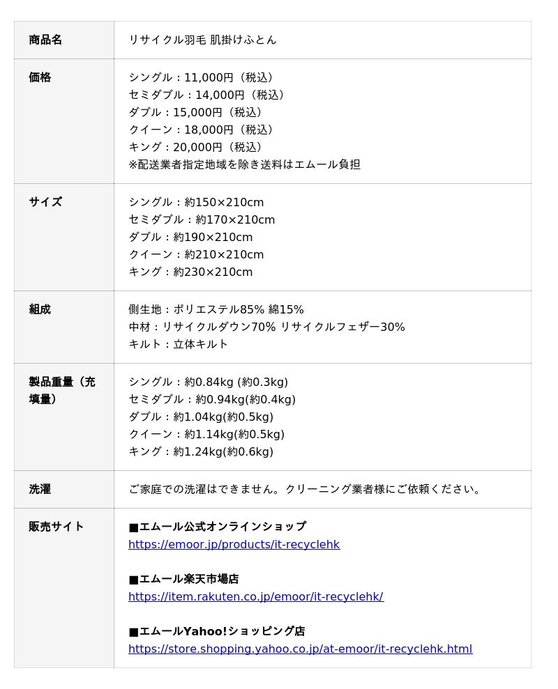 「身体に合った寝る・座る・たたむ」を提供する健康家具ブランドEMOORを展開する株式会社エムール(東京都立川市:代表取締役 高橋 幸司/以下、エムール)は、2026年4月6日より再生羽毛を使用したコストと快適性のバランスに優れたサステナブルな寝具『リサイクル羽毛 肌掛けふとん』の販売を開始しました。