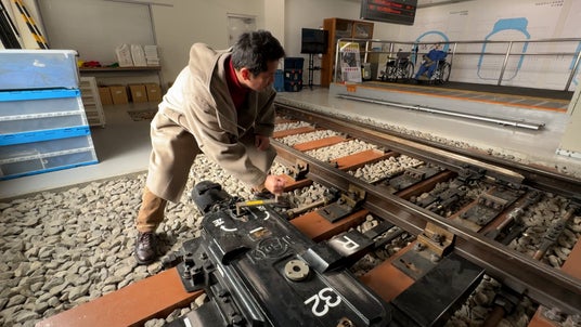 施設には、実際のホームを模した、ホーム訓練室もあった。西村はマジックハンドを操作し、線路上の落とし物を拾う体験も。さらに、線路や踏切が再現された屋外訓練施設では、遮断機にまつわる意外すぎる事実を知ることに…。