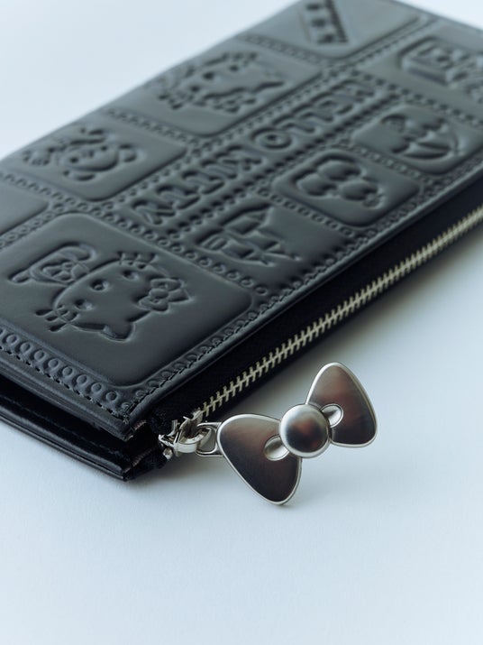 浅草橋の工房にて作られる文庫革財布。ファスナーの引手にもリボン。