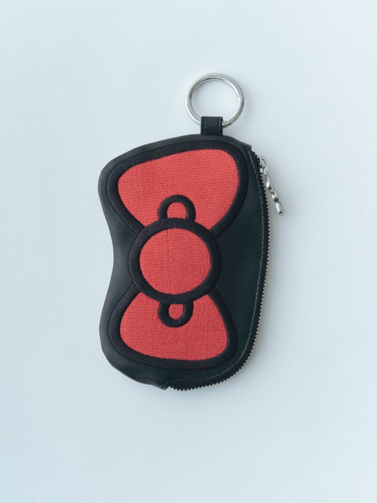 牛革ポーチに施されたビッグサイズのリボンは刺繍で。