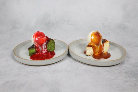 濃厚で奥行きのある抹茶のバスクチーズケーキにバニラアイスを合わせ、苺とラズベリーを贅沢に使った「ルージュソース」を添えました。抹茶のほろ苦さと、ベリーの華やかな酸味が絶妙にマッチした、後味軽やかな大人のスイーツです。
