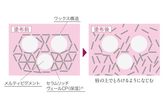 濃密なセラムリッチヴェールCP(保湿)※が溶け出すバームメルト処方。均一な厚膜が唇の縦シワを目立ちにくくして、うるおってツヤのある美しい唇に魅せます。