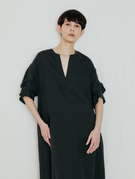 毎年ご好評をいただいている、ツイストスリーブが印象的な人気のワンピース。今季はクールなキーネックデザインを取り入れ、デコルテを美しく見せながら顔まわりをすっきりと引き立てる一枚に仕上げました。身体のラインを拾いにくいすっきりとしたシルエットに、ロング丈の揺れるヘムが女性らしい軽やかな動きを演出。ツイストされた袖のディテールがさりげないアクセントとなり、シンプルな中にも洗練された表情を生み出します。素材には、清涼感と上品さを兼ね備えた国産リネン 100%のシャツ地を使用。リラックス感を残しながらもクリーンでクリアな印象を纏う素材感が特徴です。洗うほどに肌にやさしくなじみ、リネンならではの風合いの変化を楽しみながらも、美しい表情を長く保ち続けます。軽やかな着心地と揺れるシルエットが、夏の装いを上品に彩るサマードレスです。