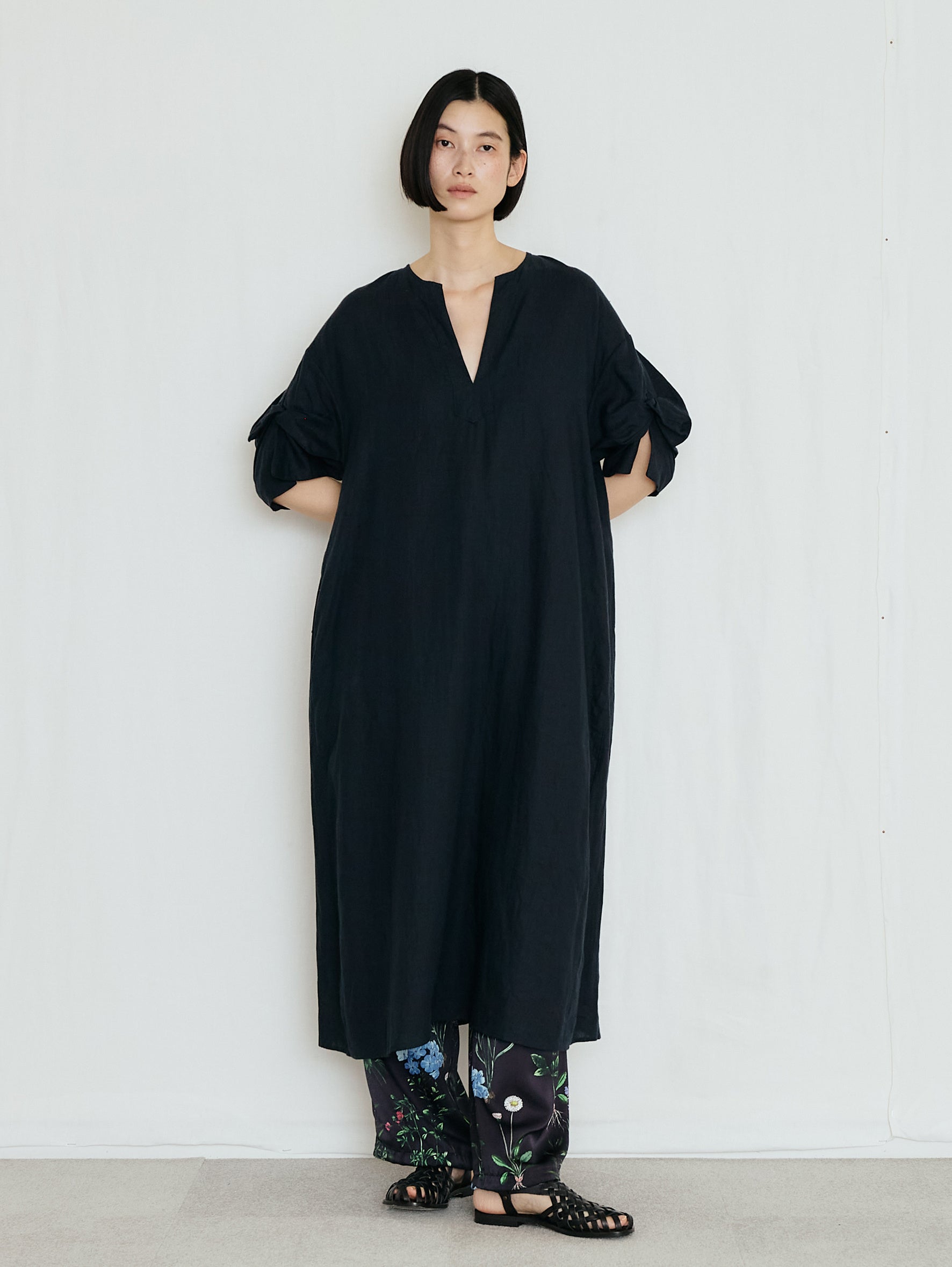 毎年ご好評をいただいている、ツイストスリーブが印象的な人気のワンピース。今季はクールなキーネックデザインを取り入れ、デコルテを美しく見せながら顔まわりをすっきりと引き立てる一枚に仕上げました。身体のラインを拾いにくいすっきりとしたシルエットに、ロング丈の揺れるヘムが女性らしい軽やかな動きを演出。ツイストされた袖のディテールがさりげないアクセントとなり、シンプルな中にも洗練された表情を生み出します。素材には、清涼感と上品さを兼ね備えた国産リネン 100%のシャツ地を使用。リラックス感を残しながらもクリーンでクリアな印象を纏う素材感が特徴です。洗うほどに肌にやさしくなじみ、リネンならではの風合いの変化を楽しみながらも、美しい表情を長く保ち続けます。軽やかな着心地と揺れるシルエットが、夏の装いを上品に彩るサマードレスです。