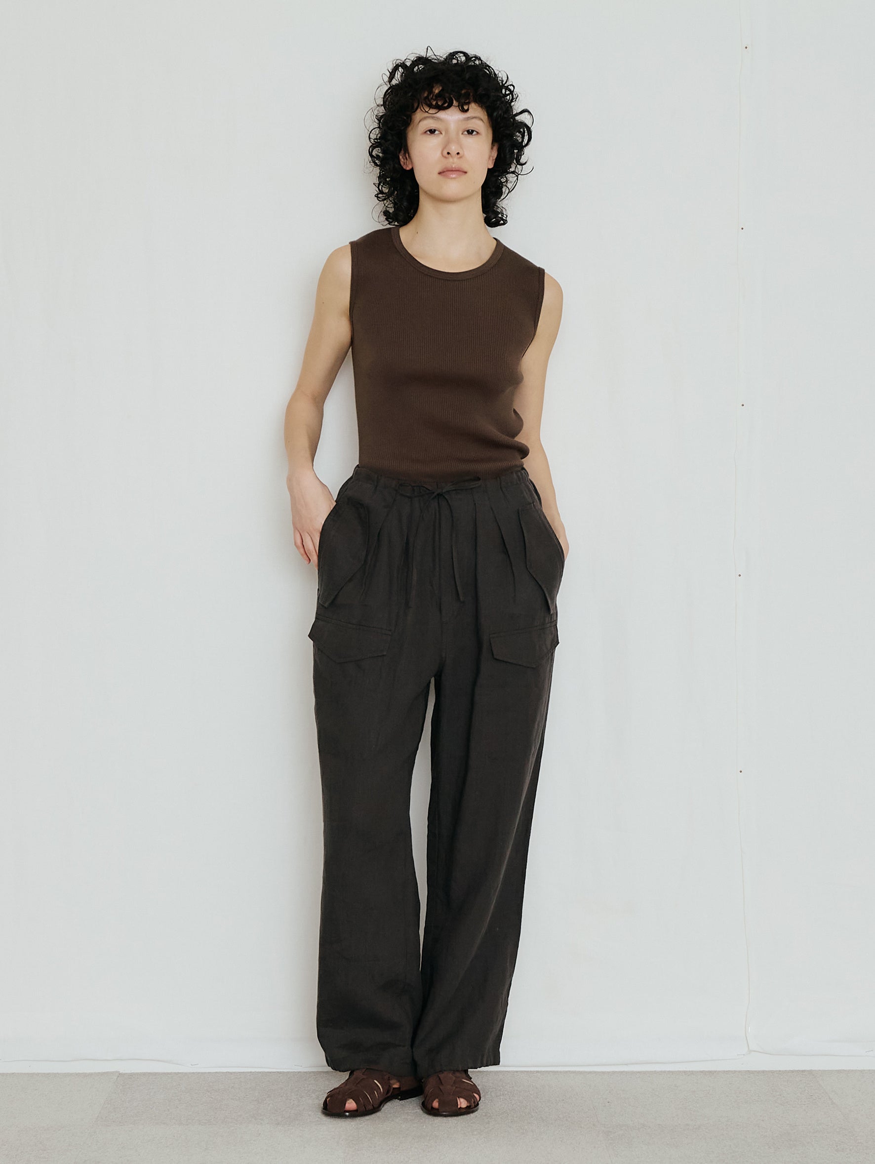 毎シーズン人気のミリタリーパンツを、やわらかく軽やかなリネン素材で仕立てたカーゴパンツ。ハードなミリタリーデザインと、しなやかなリネンの風合いが生み出す絶妙なミックス感が魅力の一枚です。今季はサイズ感を見直し、よりすっきりとしたシルエットにアップデート。リラックスした穿き心地を保ちながらも、洗練されたバランスで着こなしていただけます。夏のボトムスとして幅広いスタイリングに馴染む万能アイテムです。さらりとした肌触りと軽やかな穿き心地で、夏の装いに自然と馴染む一本です。