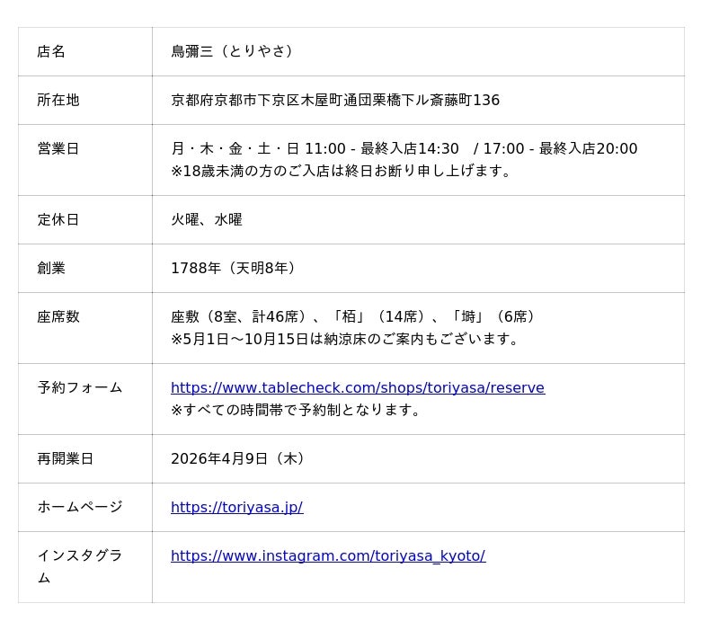 株式会社タイソンズアンドカンパニー(東京都品川区、代表取締役社長寺田心平)は、京都・木屋町で1788年から続く水炊き料亭 「鳥彌三(とりやさ)」の経営を引き継ぎ、2026年4月9日(木)にリブランディングオープンいたします。