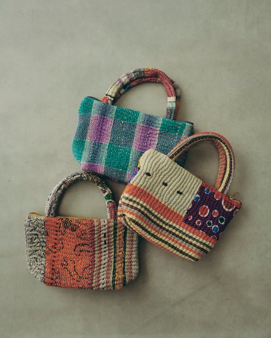 インドやバングラデシュに伝わる刺し子布「カンタ」は、古布を重ね、一針一針縫い合わせた一点物のテキスタイル。すべて異なる表情を持ち、手仕事ならではの温もりが感じられます。