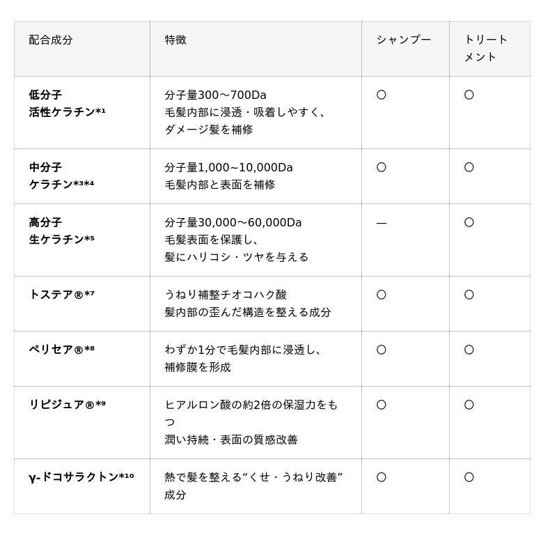 低分子“活性ケラチン”*¹とプロ指向の補修成分に、高分子“生”ケラチン*⁵で髪を外側から保護。