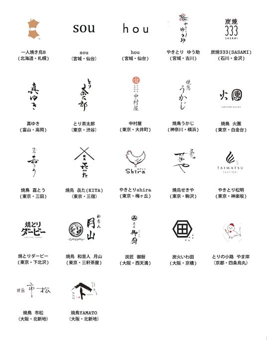 「焼鳥の新たな楽しみ方」と「山椒の未来」をともに育むパートナーとして、北海道をはじめ、東北、北陸、関東、関西など、全国各地の焼鳥の名店が、「立ち飲み焼鳥 w/REISHI GIN,」に賛同しています。